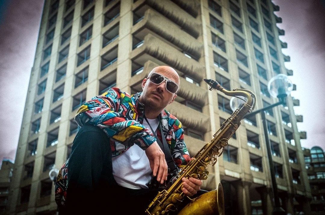 Gallery of photo images of sax player, Adriano Rossetti-Bonell, Plays With Horn, playing saxophone on stage solo and with various different artists, such as UB40, Reggae Roast, Fun Loving Criminals.